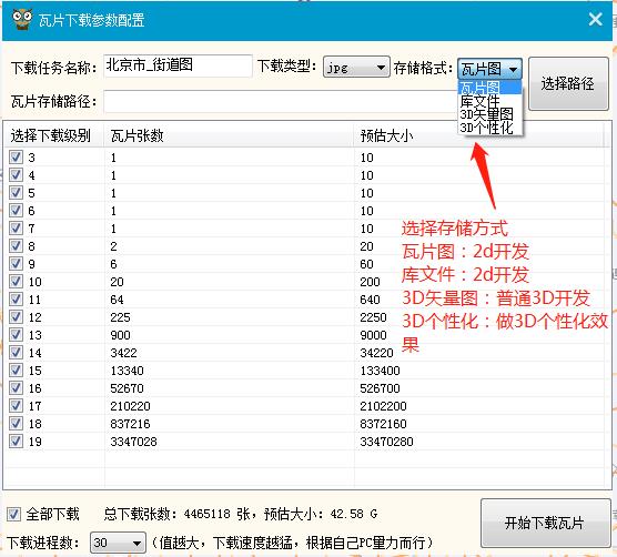 2)、选择下载参数,勾选地图下载的级别,存储格式可选2D或3D数据(如下图)